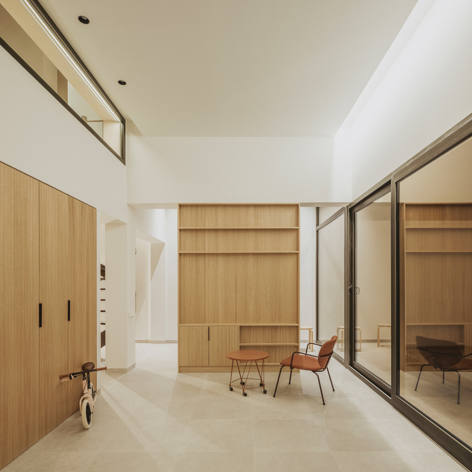 Tras el acceso, la primera crujía acoge una escalera de caracol que se erige como una pieza escultórica: blanca, pura y bañada por una luz cenital. En el extremo opuesto se sitúa un baño cuidadosamente integrado. La siguiente crujía alberga la zona de día —salón, cocina y comedor—, acompañada por un estudio y el dormitorio de Kiwi, un camaleón. Ambos espacios se separan mediante un elemento de madera que actúa como librería, incorpora almacenamiento, televisión y una chimenea que se abre a ambos lados. Esta franja, de mayor altura, permite que el interior respire el exterior a través de amplias aberturas hacia el patio posterior y una rasgadura en el forjado sur que filtra los rayos del sol invernal.